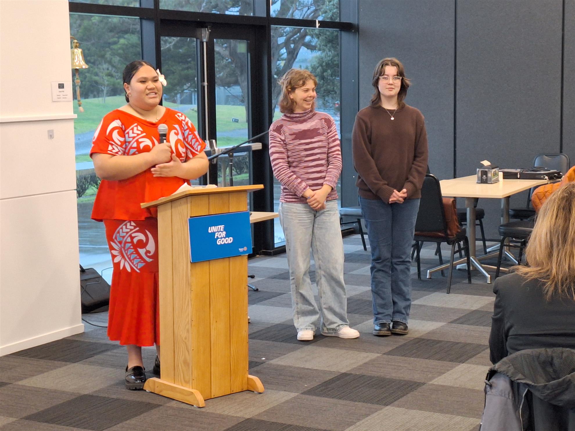 Next up were the three IYM sponsored students who recently attended the Residential in July, which featured in our last Newsletter. Leanne (speaking), Caitlin and Katrina (how could she fail to be picked?!) who were all accompanied by proud parents, offered wonderful takeaways from the experience, with Leanne describing the event as the best school holiday she had ever had.